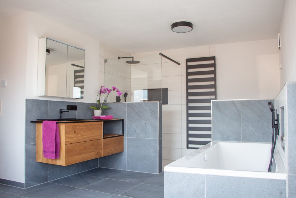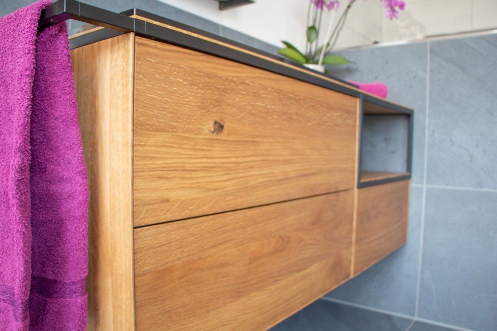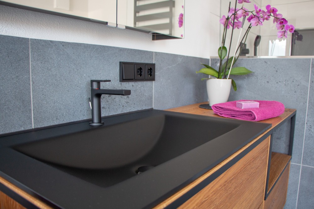 Da den Kunden Nachhaltigkeit wichtig war, wurde das bei der Produktauswahl berücksichtigt. Folgende Materialien wurden verwendet: Echtglas, Keramik, massive Wildeiche, Mineralwerkstoff, Fliesen aus Steinzeug.