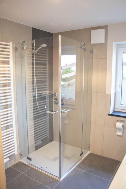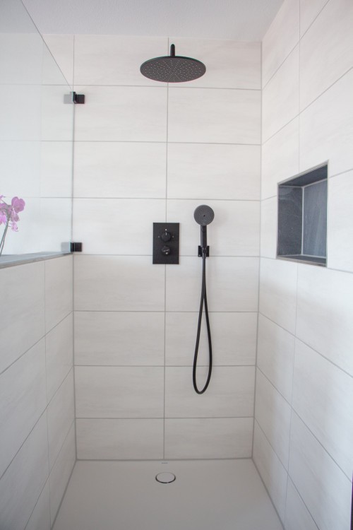 - Bodenebene Dusche mit Duschwanne aus hochwertigem Mineralwerkstoff