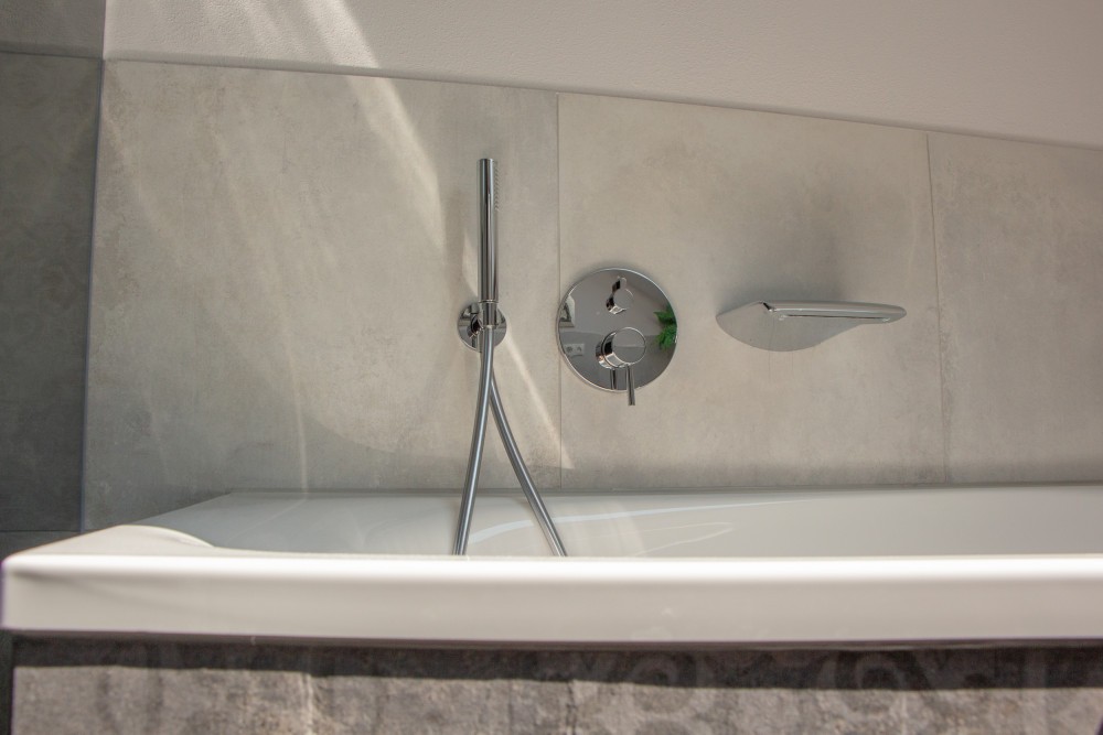 Alles wir mit verschiedenen Beleuchtungsvarianten für ein behagliches Ambiente abgerundet. Die Untertritt Beleuchtung der Badewanne lässt diese schweben