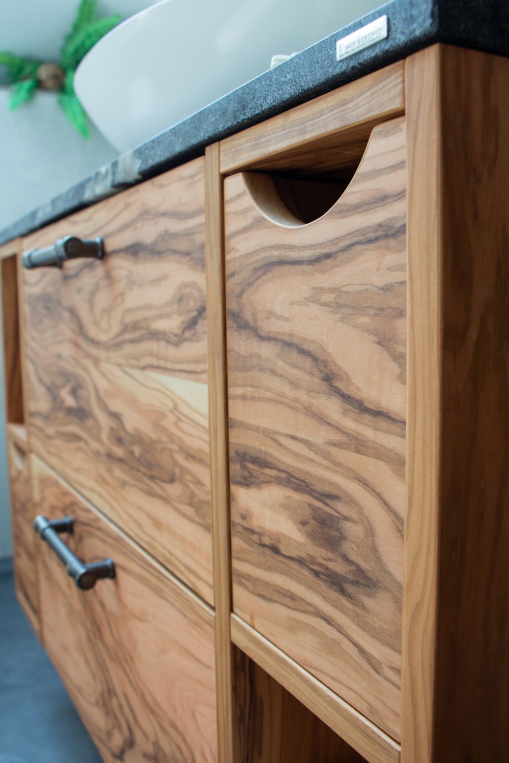 - Elegante Waschtischanlage aus Olivenholz, mit ovaler Aufsatzschale