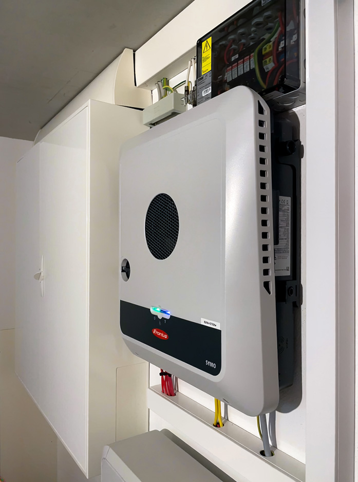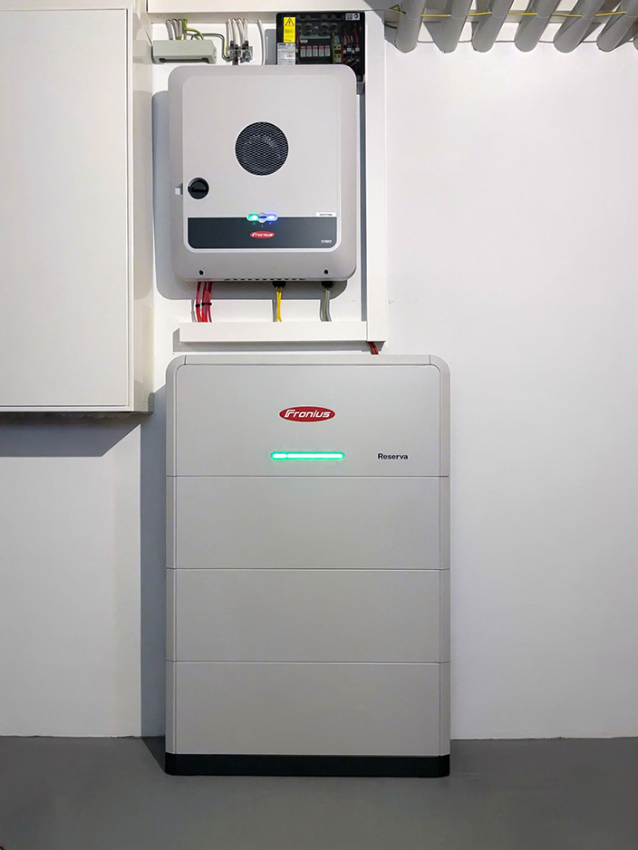 Das große Satteldach mit idealer Südausrichtung bot perfekte Voraussetzungen für eine Photovoltaikanlage. Eine bestehende Solarthermieanlage war bereits installiert – nun wurde das Energiekonzept konsequent erweitert. Ergänzt wird die PV-Anlage durch einen modernen Batteriespeicher, der den tagsüber erzeugten Strom für die Abend- und Nachtstunden verfügbar macht.
