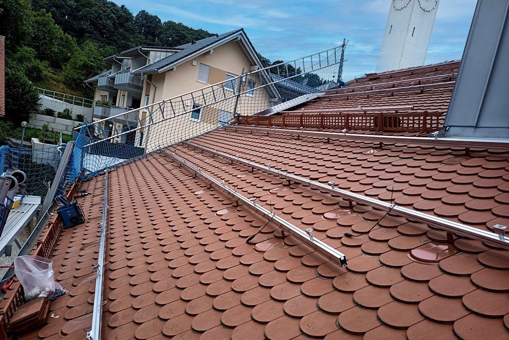 Damit sich die Solarpanele im Winter schneller vom Schnee befreien können, haben wir hier mit einem speziellen System gearbeitet. Dadurch, dass zwischen den Solarpanelreihen etwas Platz gelassen wird und der Anstellwinkel der unteren Reihe etwas höher liegt als die obere Reihe, rutscht dann der Schnee sozusagen unter bzw. hinter die Panele. So liegt die Oberfläche schneller wieder frei und kann Sonnenenergie verarbeiten.