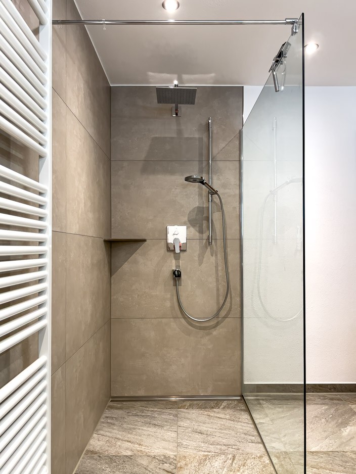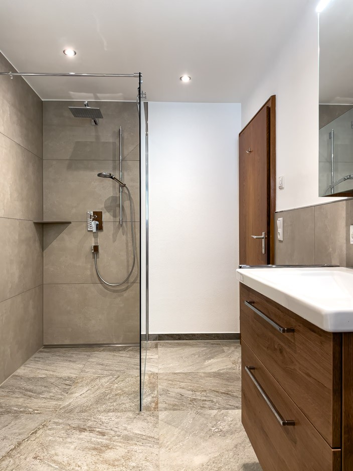 Sicherheit und ausreichend Platz beim täglichen Duschen durch die große bodenebene Dusche mit rutschhemmenden Bodenfliesen im Duschbereich und auf dem gesamten Badezimmerboden