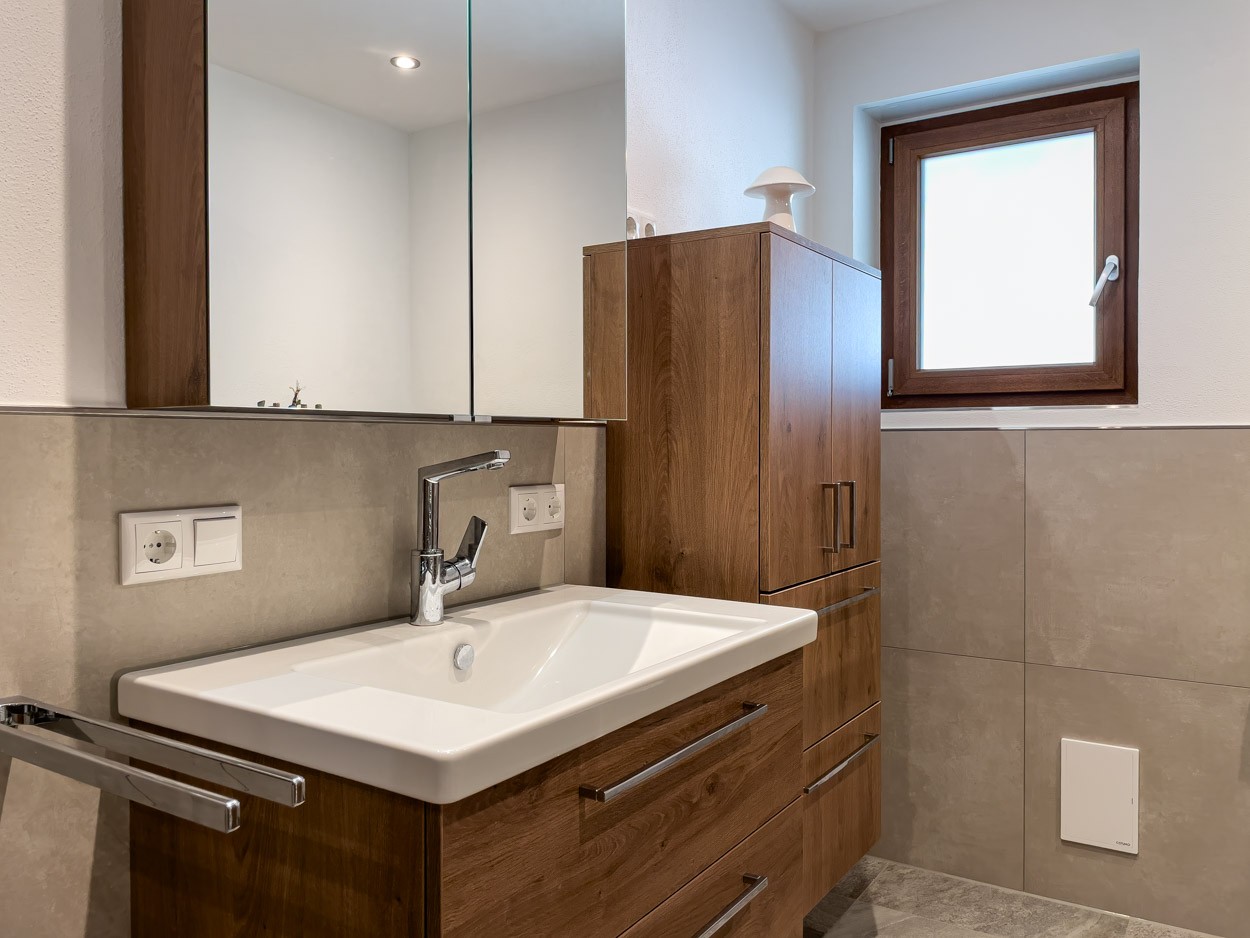 mehr Stauraum im Bad durch Badmöbel in ansprechendem Holz-Dekor passend zur Fliesengestaltung