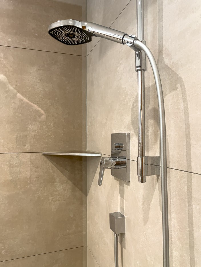 - Großer bodenebener Duschbereich 100x140cm, mit rutschhemmenden Bodenfliesen